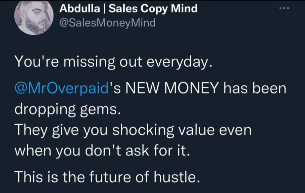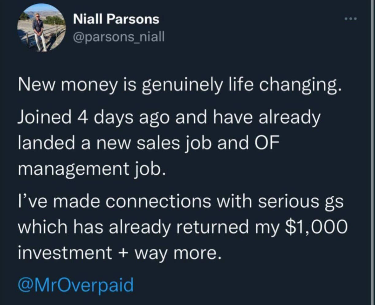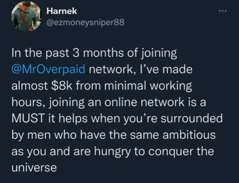 Bro you should join NEW MONEY if you are a young dude trying to make money online and want to increase your connections. Everyone inside the group is super hungry to level up their life and everyone is very supportive.If you feel like most people IRL aren’t on your level or on the same wavelength as you then you need to join NEW MONEYMore reasons:- Lots of different business opportunities inside the group.- SALES JOBS offered- We have one-on-one coaches on-demand inside the group to ensure you have a clear blueprint on where you are going- Challenges and goals set for all members to ensure progress is made (accountability).- You will learn how to make way more money or begin making money- Access to a network of like-minded individuals- Help with taxes- Replace your current loser friends- Learn from specialists in different industriesYou should join NEW MONEY because you will have 940 ambitious people helping you achieve your goals and all the materials and information that you could possibly needEvery NEW MONEY member is actively improving themselves and helping each other.We host DAILY live calls that include Q&As and presentations with leaders in the groupWe also host regular in-person meetups. We've already met in Bali, Miami, Dubai, Istanbul, Los Angeles, London, and Bucharest.