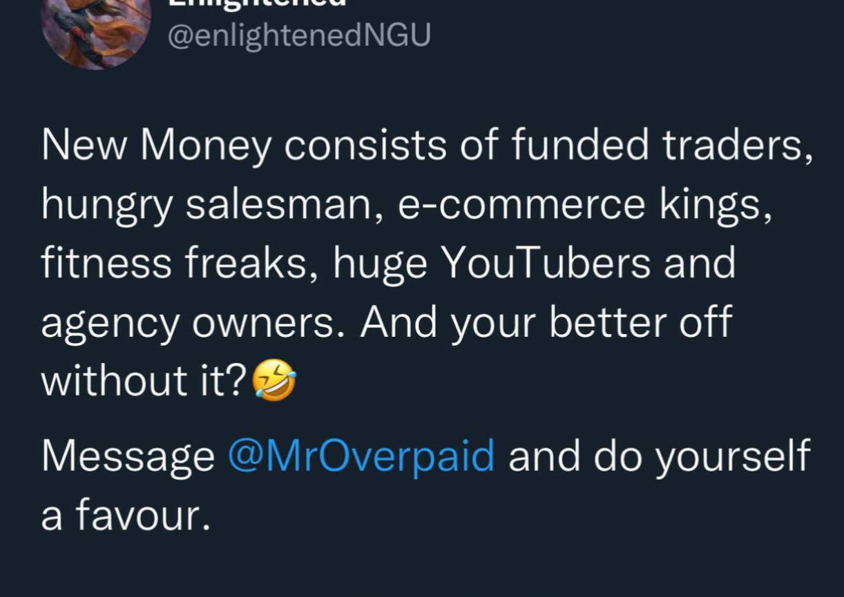 Go to the MEDIA SECTION of this telegram channel to check out all the testimonials.If you listen to a bunch of the voice notes and don’t really resonate or relate to what I'm saying then NEW MONEY is not for you.
